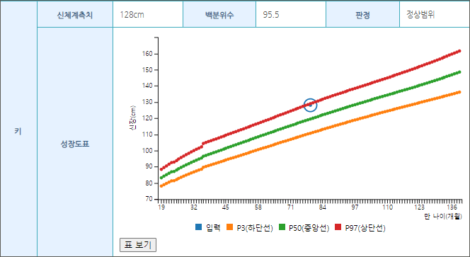 계산기에 정보를 입력하시고 측정을 누르시면 자녀의 백분위 및 아래와 같이 P3(하단선), P50(중앙선), P97(상단선) 정보와 함께 그래프를 보여주기 때문에 한눈에 아기의 성장발달 정도를 보기 쉽다는 장점이 있습니다.